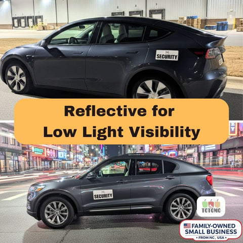 Professional Grade Security Vehicle Identification The TOTOMO Reflective Security Magnet Set is designed for those who require clear, high-contrast vehicle marking without the commitment of permanent decals. Whether you are conducting night patrols, managing event security, or providing neighborhood watch services, these magnets offer the perfect balance of visibility and convenience. Nighttime Safety & Reflection Safety is paramount during night operations. Our magnets utilize advanced reflective technology that catches and bounces back light from headlights and surrounding sources. This ensures that your "SECURITY" designation is readable even in total darkness, alerting others to your presence and authority. No-Damage, Easy Application Forget messy stickers and adhesive residue. These magnets are engineered for quick application on any flat, steel vehicle surface. They are easily removable, making them ideal for contractors who use their personal vehicles for work. When not in use, simply peel them off and store them flat.
